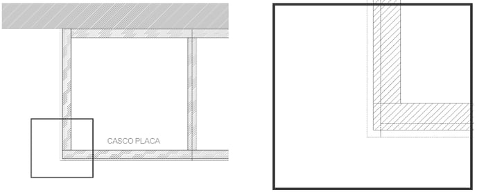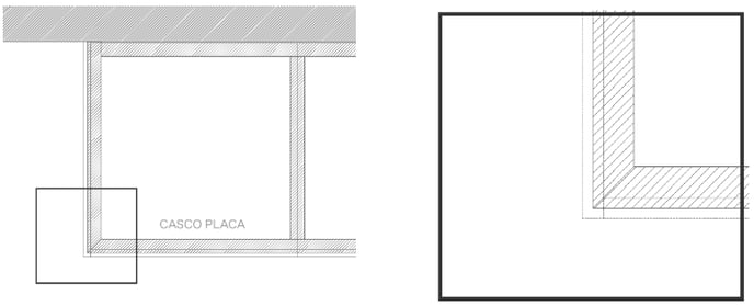 En el caso de que tengamos un lateral visto, como en el lado izquierdo planta, además de desplazar los perfiles metálicos como hemos indicado anteriormente, debemos cortar la tira por ambos extremos, para que asiente completamente por encima del perfil, que no debe eliminarse.