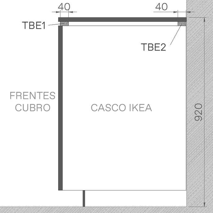 Las tiras bajo encimera (TBE) son piezas de aproximadamente 4x230cm que se disponen entre el mueble IKEA y la encimera. Su función es principalmente estética, ya que elevan ligeramente la encimera y permiten generar un pequeño vuelo respecto a los frentes.