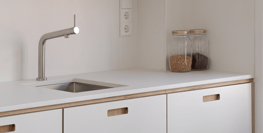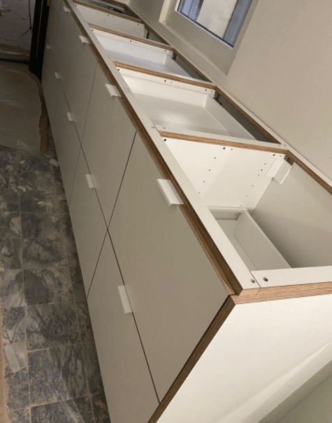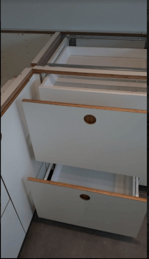 Nuestra recomendación es montarlas retranqueadas hacia dentro de las estructuras IKEA, 1 cm con respecto a nuestros frentes, creando una línea longitudinal entre la encimera y los frentes.