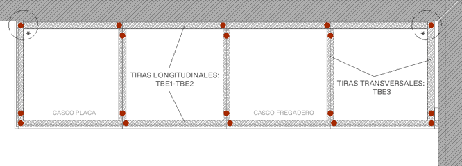 Las TBE deben colocarse siguiendo toda la línea longitudinal del frente de la cocina, tanto por la parte frontal como por la parte posterior del conjunto de cascos.