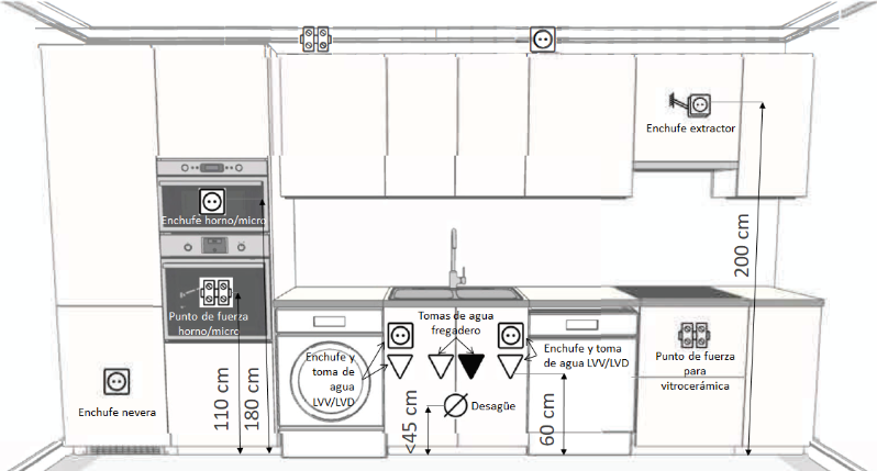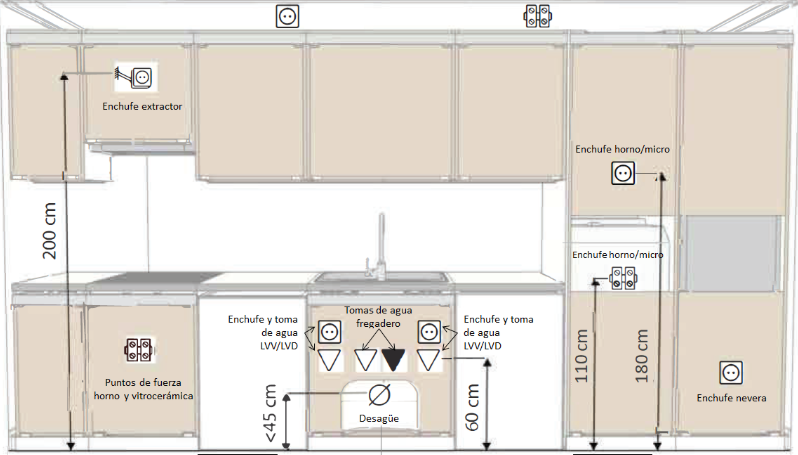 Lavavajillas/lavadora: 65 cm del suelo, en módulo contiguo.